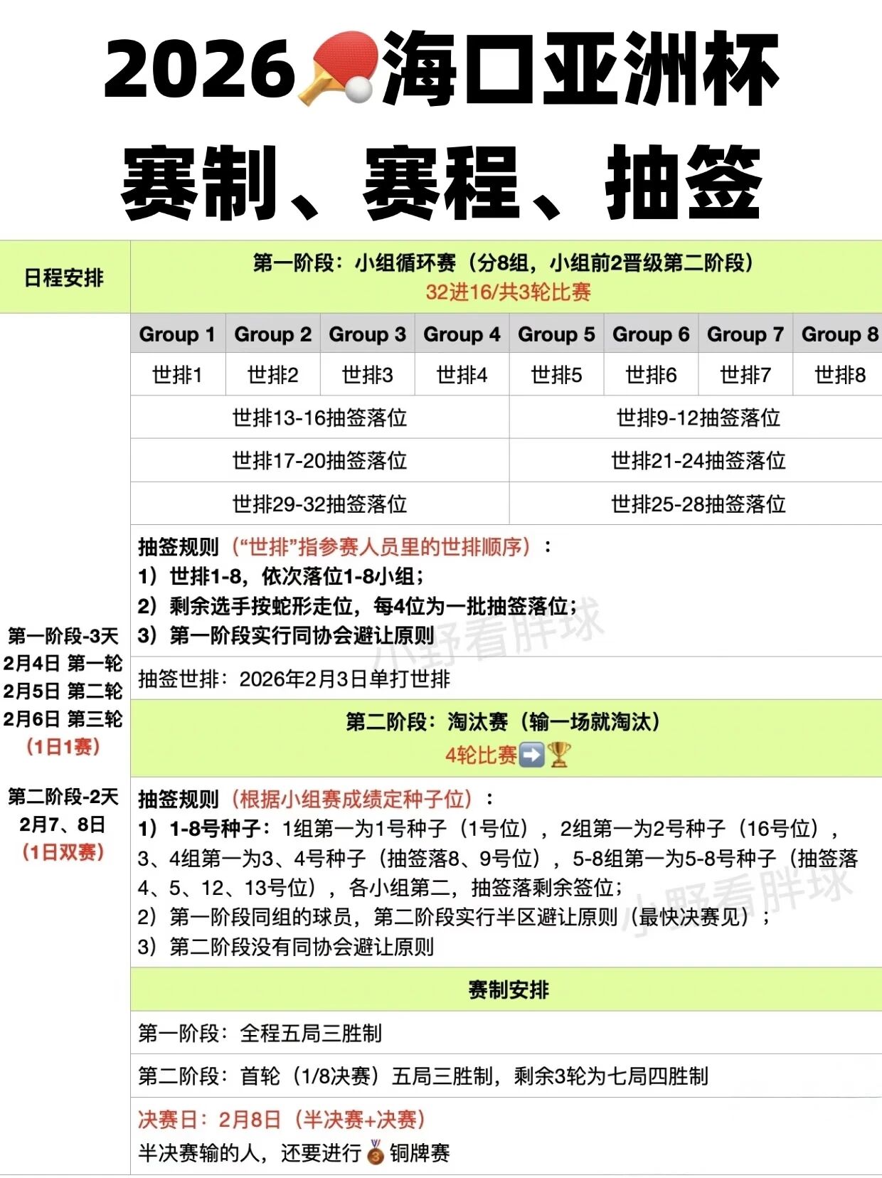 赛制的设计进一步放大悬念:小组赛采用五局三胜制考验选手快速进入状态的能力,从1/4决赛起升级为七局四胜制,检验选手的体能储备和临场调整能力。2月4日至6日的小组赛将决出16强,2月7日连打1/8决赛与1/4决赛,2月8日的决赛日将先后上演半决赛、季军赛和冠军战,紧凑的赛程对选手的抗压能力提出极高要求。央视体育全程直播的安排,将让全国观众见证这场亚洲乒坛的开年盛宴。