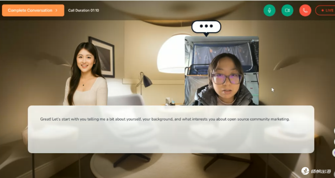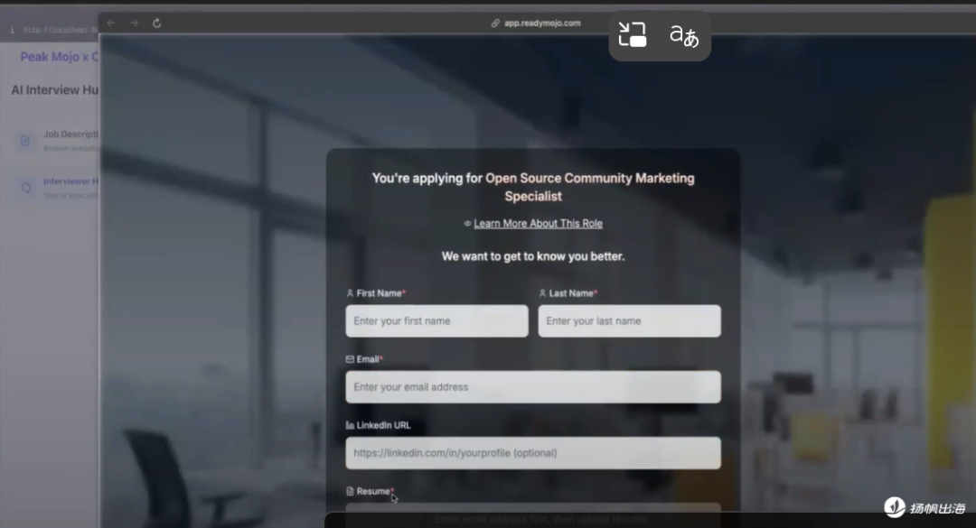 与传统AI的机械式提问、求职者被动回答问题模式不同,在此平台的一面中,求职者的体验感是偏向灵活轻松的,且是可以通过交流成为面试“主导者”的。AI面试官也是直接采用了Peak Mojo CEO 蓝天的人物形象,让用户在视觉上感受到一定的亲和力。