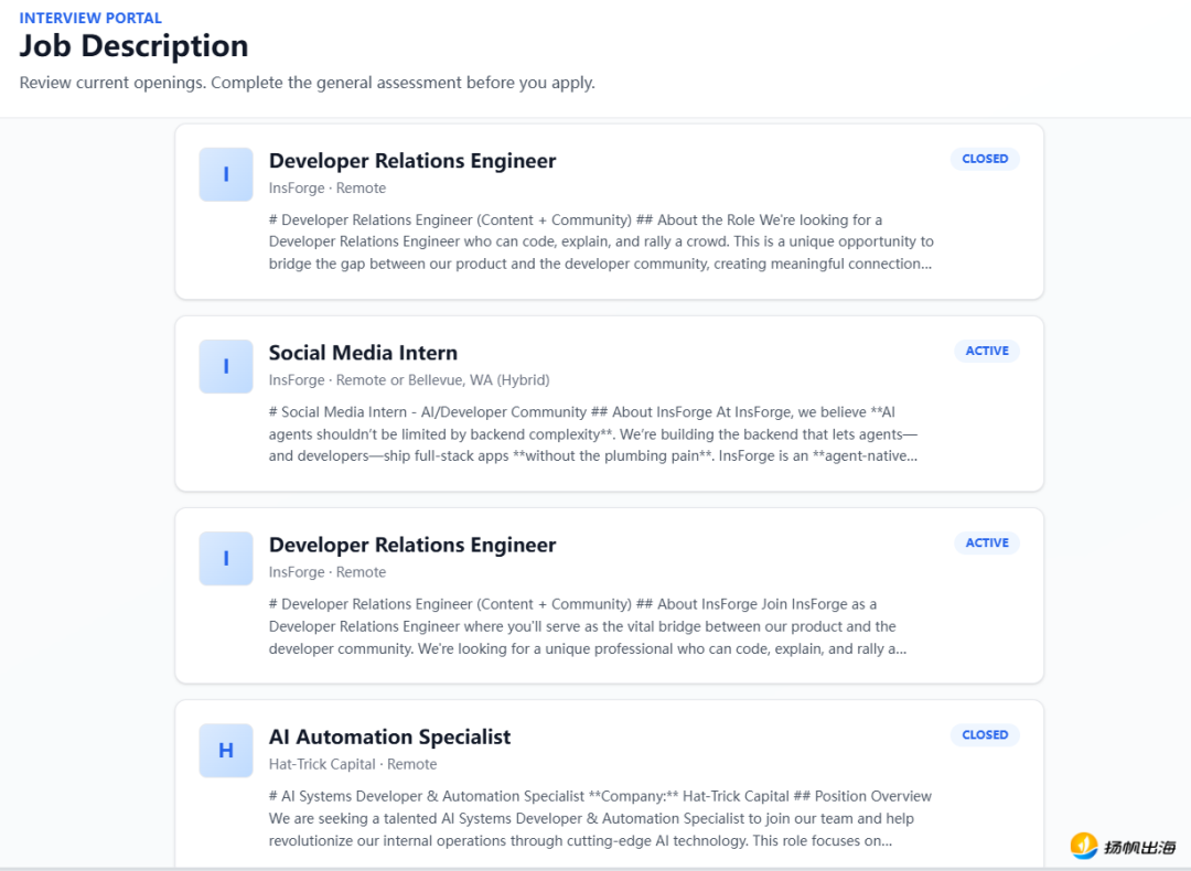 其中,Peak Mojo是平台中多个AI Agents的开发方,OpenAgents则是一个开源框架,能够让这些Agents相互协作。目前,这一面试平台已被北美40多家AI Native创业企业采用,主要面向技术人员的招聘,覆盖了全栈工程师、AI 应用工程师、后端等上百个技术岗位,其中60%为中高级岗位。
