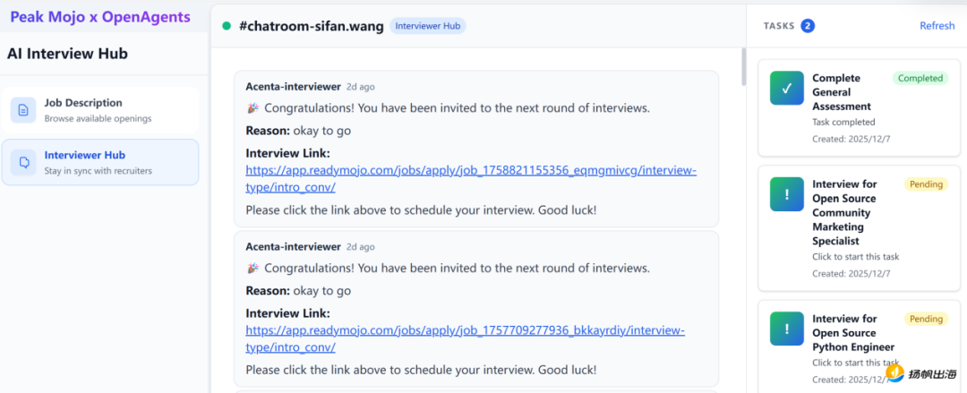 但随着AI的智能程度加深,这些痛点问题也在逐渐被优化解决。比如,由OpenAgents与Peak Mojo共建的一个AI面试平台Peak Mojo AI interview Hub(以下简称Peak Mojo Hub)就通过全流程的AI Aegnt面试,让招聘变得更加高效,也极大的缩短了面试流程。