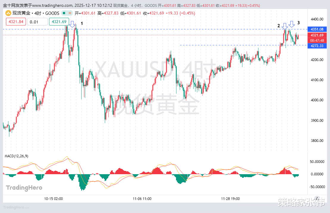 黄金图中,我们标注了1,2,3依次为,今年10月份下跌关口位置4353,2,3的位置,是上周五以及周一出现两次突破无果的走势,而这个点位难以突破就会上涨被压制。