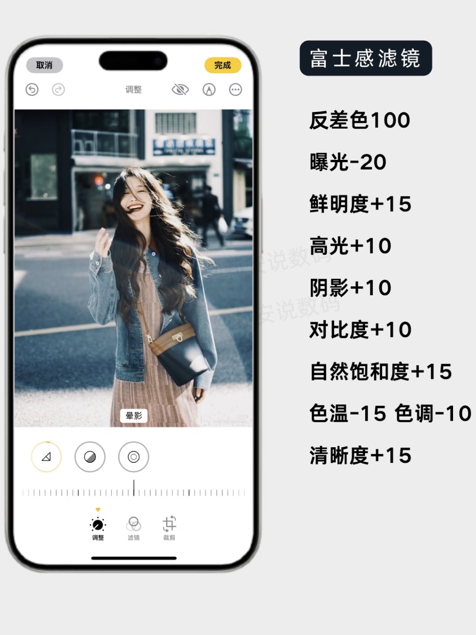 穿新衣出门玩,想要那种文艺又有质感的照片?这个滤镜就是模仿经典的“富士胶片”色调。核心逻辑是:独特的反差色处理 + 低饱和复古感。iPhone 17的“反差色”功能是这一招的灵魂。