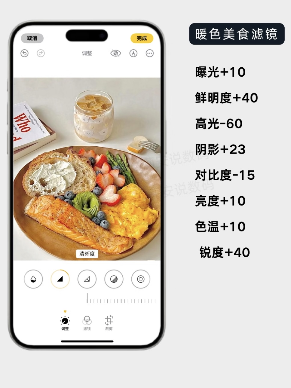 ①曝光+10、鲜明度+10、亮度+10 这一步就像是把房间的灯调亮了。让整体画面更通透,食物看起来不那么“脏”。