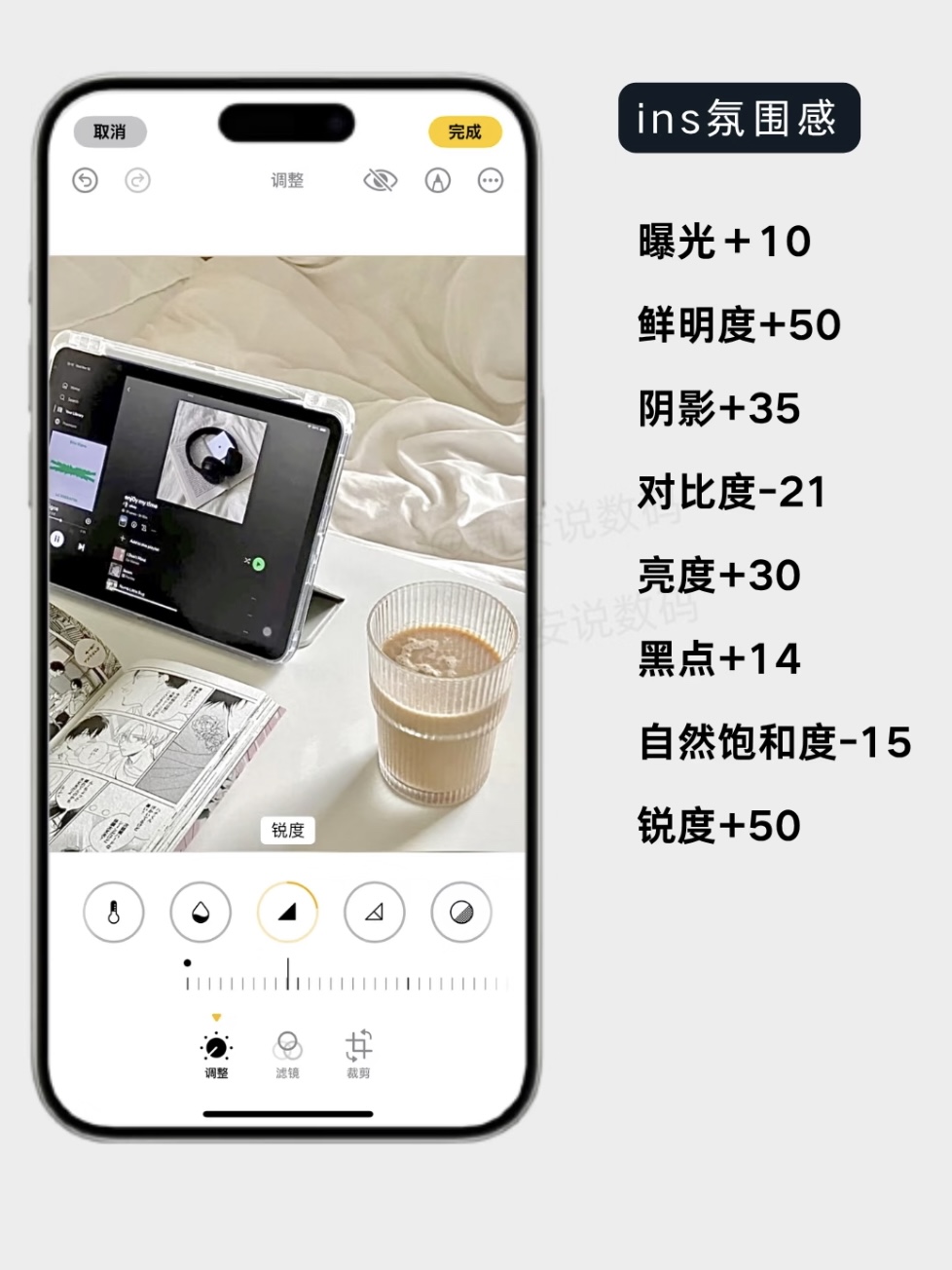 ①曝光+10、鲜明度+50、亮度+30 大幅度提亮画面,让皮肤看起来白皙透亮,瞬间拥有“冷白皮”。