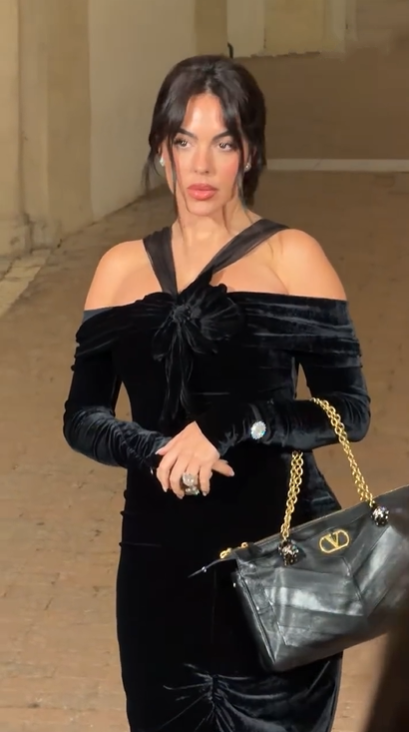 大家都知道乔治娜原本就很丰腴,新造型却显瘦又显高挑,审美也在线;先看她的服装,一袭天鹅绒裙秀出迷人香肩,看着像是一字肩款式,还有两条丝带固定,脖子里并没有佩戴任何首饰,却依然美出新高度!