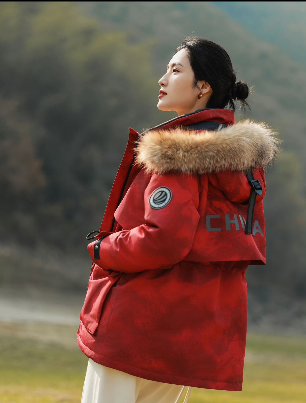 最让人惊喜的是它的“内外兼修”!表面是防风防泼水面料,过年遇到雨雪天也不怕,内里填充的是700+高蓬松鹅绒,90%的绒子含量,摸起来又软又轻,保暖性直接拉满。而且还藏了黑科技——外层升温面料能主动吸热升温,内层蜂巢里布牢牢锁温,北方零下十几度穿一件内搭就够,南方湿冷天也能暖烘烘的。还有可拆卸的貉子毛领和超大工装口袋,实用性拉满,拜年塞红包、装手机都不用带包,细节太贴心了。