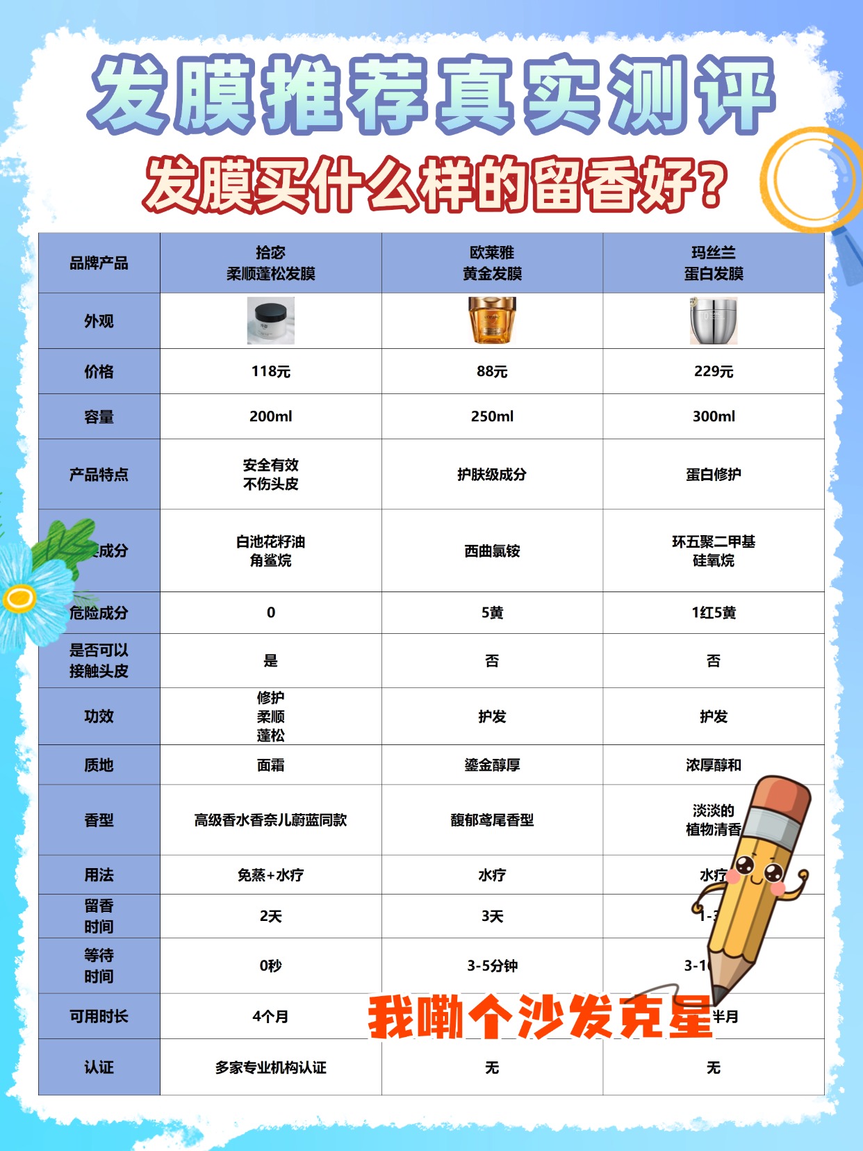 很多人分不清发膜和护发素,总问两者选哪个好?今天就给大家说清楚!护发素主打即时顺滑,成分多是阳离子表面活性剂和硅油,只能作用于发丝表层,效果维持 1-2 天,适合每次洗头后用;发膜以氨基酸、角蛋白等小分子成分为主,能渗透到发芯填补受损空洞,修护效果能维持 1-2 周,建议每周用 1-2 次。要是你既想要护发效果又喜欢香香的味道,选发膜准没错,很多发膜的留香时间比护发素久,而且滋养度更够。下面是我整理的喂饭式选购总结,不管是选发膜还是护发素都能用得上,快收藏起来慢慢看~