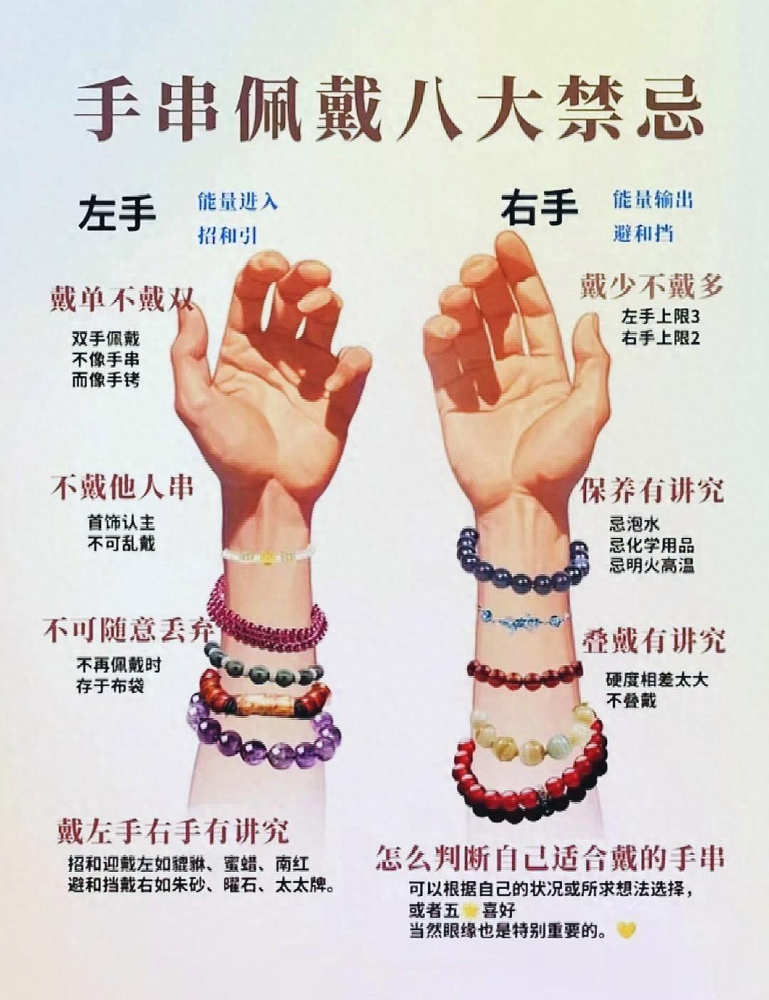 左手:能量入口——适合戴招福、吸引类手串,比如黄水晶招财、粉水晶招桃花、蜜蜡养人。