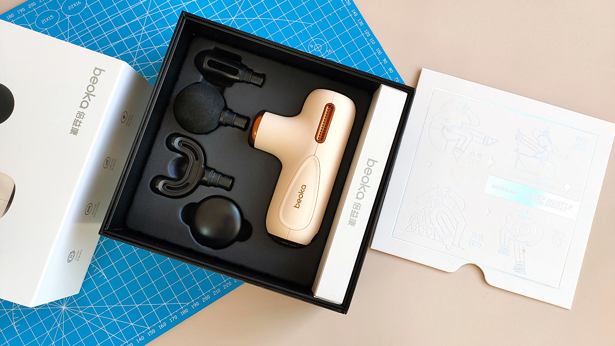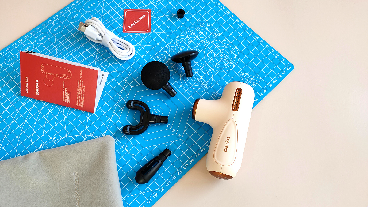 盒子内包括筋膜枪、4款不同形状的按摩头、Type-C充电线、收纳袋、备用橡胶圈、一份说明书以及合格证等。