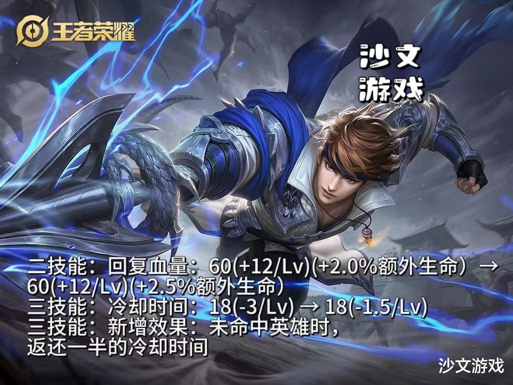 首先,赵云这个英雄在本次更新中得到了一定程度的加强。他的二技能回复血量从原来的60(+12/Lv)(+2.0%额外生命)提升到了60(+12/Lv)(+2.5%额外生命),在这个版本中赵云本来就不弱,但是这次增强将使得赵云在战斗中的生存能力得到更好的提升。同时,他的三技能冷却时间从18(-3/Lv)调整到了18(-1.5/Lv),整体是加长了赵云的三技能冷却时间,但是,三技能还新增了一个效果:未命中英雄时,返还一半的冷却时间。也就是清兵打野冷却只有9秒的冷却,这将进一步增强赵云打野和清线的作战能力,而不影响去线上抓人时没有技能。