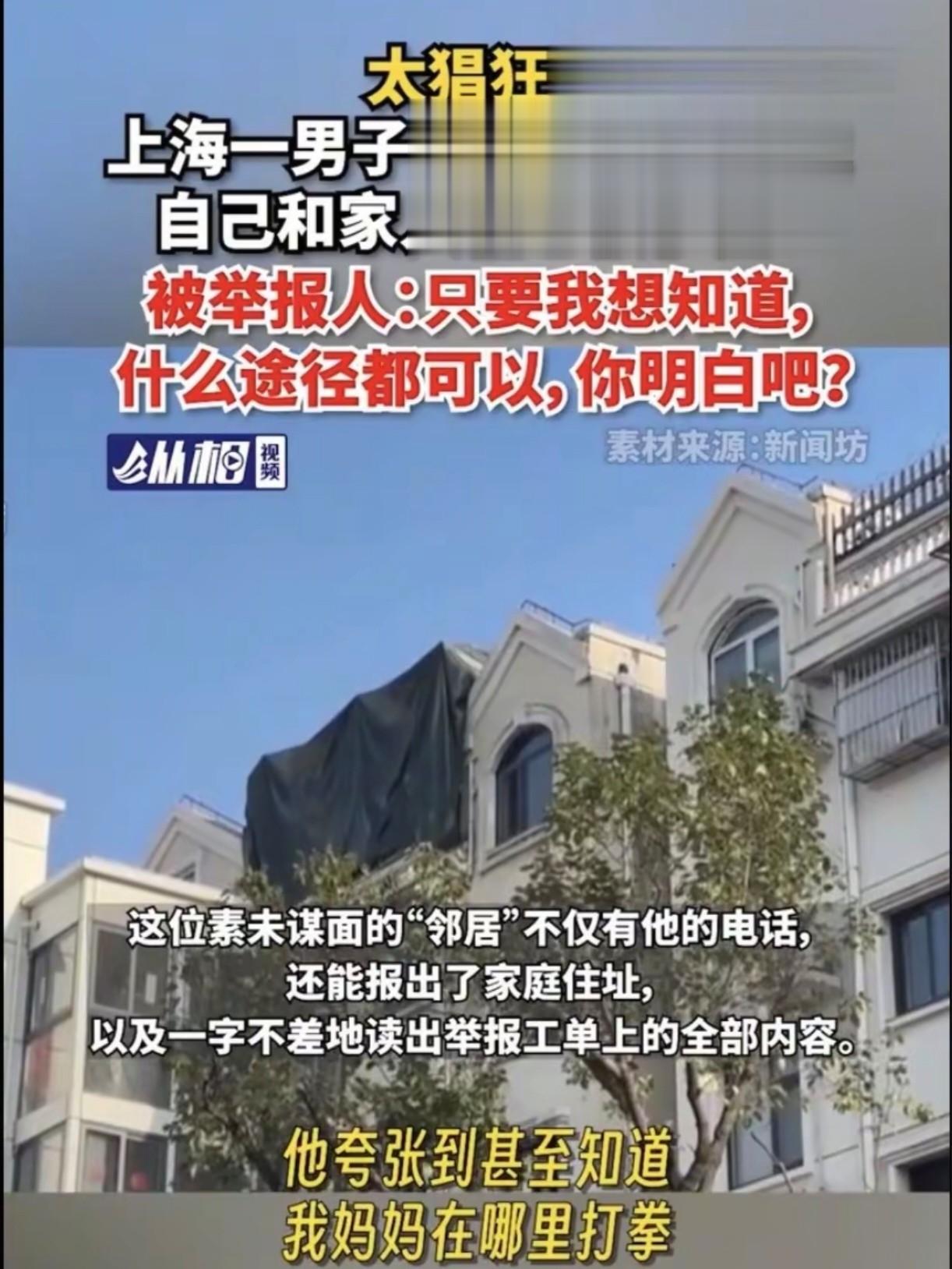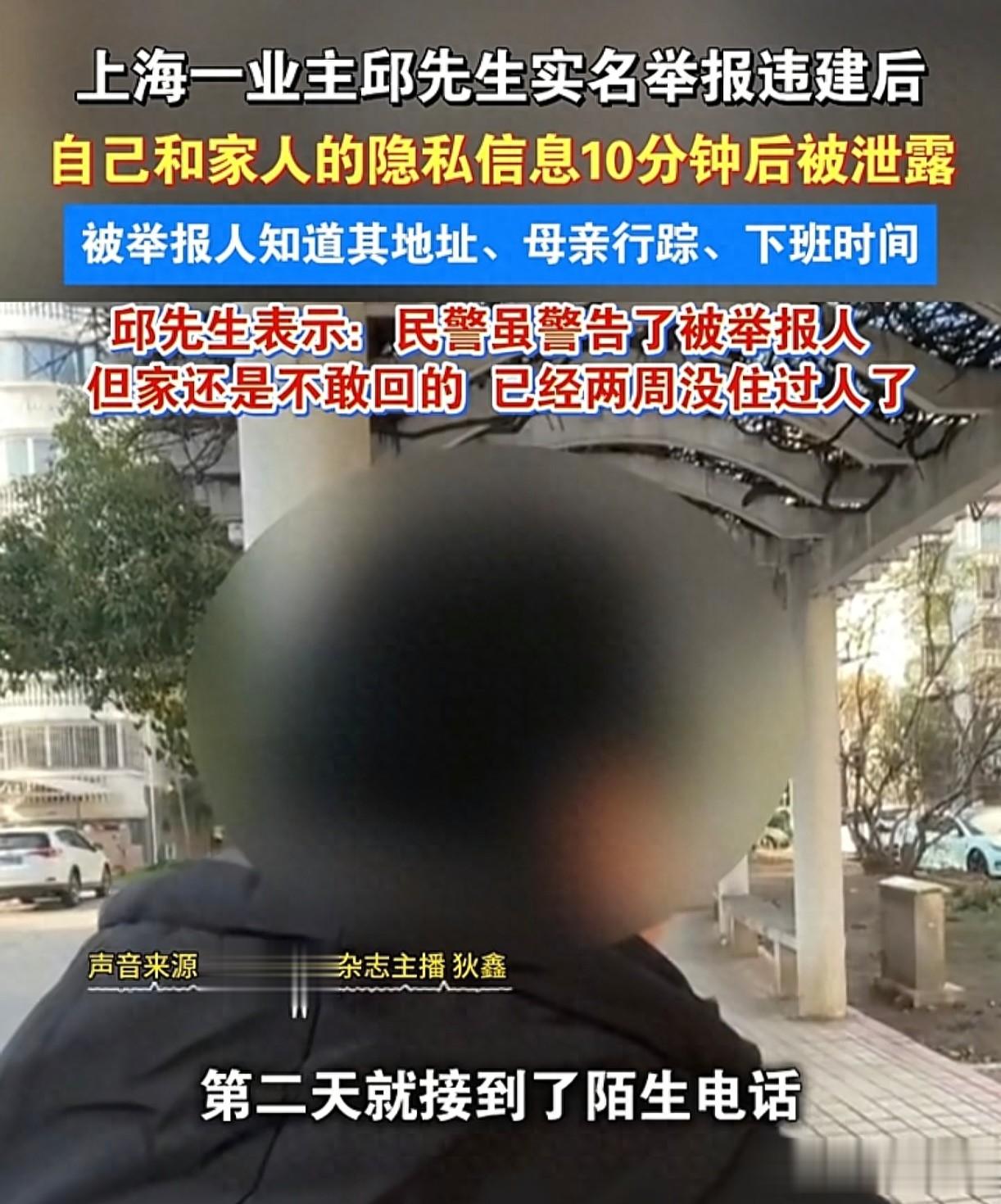 “这哪还有说理的地方!”上海宝山区,一邱姓男子通过12345实名举报小区楼顶疑似违建,然而,他还没有等来有关部门的回复,却先接到被举报人的威胁,至今都不敢回家。