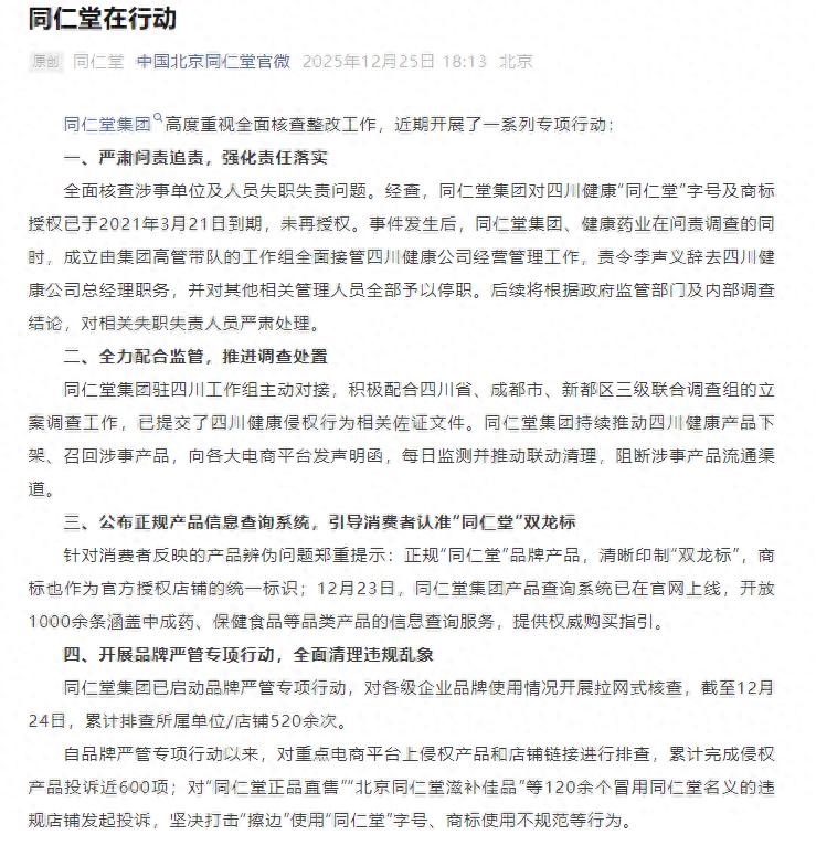 此外,北京同仁堂集团驻四川工作组主动对接,积极配合联合调查组的立案调查工作,已提交了四川健康侵权行为相关佐证文件。同仁堂集团持续推动四川健康产品下架、召回涉事产品,向各大电商平台发声明函,每日监测并推动联动清理,阻断涉事产品流通渠道。