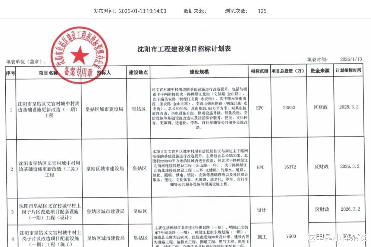 (图片来源于沈阳市公共资源交易网截图)根据沈阳市工程建设项目招标计划表,沈阳市皇姑区文官村城中村周边基础设施更新改造工程已经招标。一期项目具体包括与城市主干网衔接的次干路鸭绿江北街(文储路—金山路)、次干路圣安路(鸭绿江北街—永安街)、次干路永安街南段(圣安路—金山北路)、支路山姆南侧路(鸭绿江街—永安路),总长8050米,对其实施道路改造和公共服务设施改造。二期项目包括次干路鸭绿江北街南连接线建设工程(金山路—一环)、次干路鸭绿江北街北连接线建设工程(三环—文储路)建设工程,工程总长5500米。