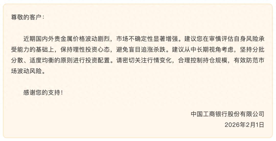2月1日,中国工商银行股份有限公司发布“关于进一步做好贵金属市场风险防范的提示”。