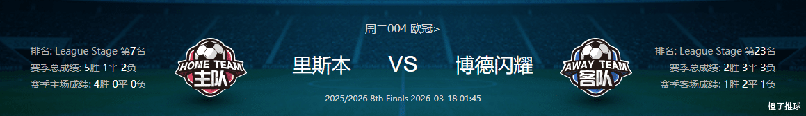 博德闪耀创造了本赛季欧冠的神话之旅,作为欧冠历史上最北的参赛球队,他们此前长期征战欧协联与欧联杯,本赛季是他们队史首次闯入欧冠正赛,却打出了现象级表现,球队在小组赛阶段濒临出局后,接连击败曼城与马竞,附加赛又淘汰国际米兰,成功晋级16强,1/8决赛首回合,更是在主场3-0横扫里斯本,豪取欧冠5连胜,且连胜对手均为五大联赛豪门,含金量十足。此番做客挑战首回合完胜的对手,球队心态占据绝对优势,核心战术执行力与竞技状态正处于巅峰。