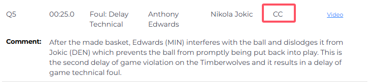 距离比赛结束还剩25秒,爱德华兹突破暴扣后吃到技术犯规,裁判报告指出:进球后,爱德华兹干扰并拍掉了约基奇手中的球,导致球未能被及时发入场内。这是森林狼队第二次延误比赛违例,因此被判罚延误比赛的技术犯规。