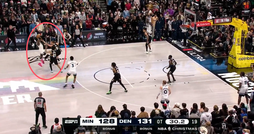 末节和加时赛最后2分钟唯一一次漏判发生在加时赛最后时刻,爱德华兹进攻时遭遇约基奇和穆雷的夹击,在约基奇的干扰下传球失误,掘金抢断后约基奇造成麦克丹尼尔斯犯规,最终约基奇两罚一中;裁判报告指出,距离比赛结束还剩30秒,约基奇包夹时打到了爱德华兹的手臂,这影响了爱德华兹传球,应该吹罚约基奇打手犯规,华子本该获得两次罚球。