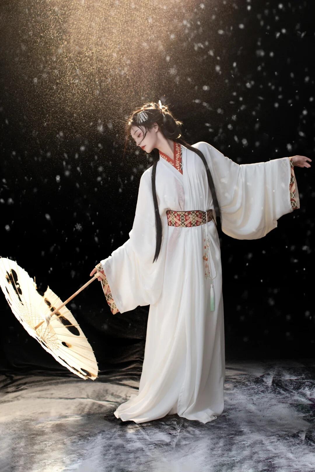 色彩搭配:服装以象牙白、驼色、绛红等暖色系为主,搭配狐毛、獭兔毛等材质的围脖或披风,增加保暖性与质感。例如,身着象牙白直裾汉服,外搭绛红色披风,在雪地背景下形成“红白相映”的鲜明对比。配饰可选择银质或玉石材质的饰品,与冬季的清冷感形成呼应。