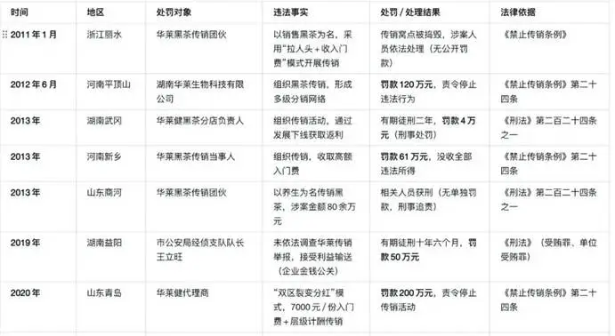 2011年,浙江丽水市工商局经检支队打掉华莱黑茶传销团伙,查处其“拉人头+收取入门费”的行为,揭开其违规经营的冰山一角;2012年,河南平顶山市查处湖南华莱生物传销活动并处以120万元罚款;2020年,山东青岛市华莱健代理因使用“双区裂变分红”传销模式被罚200万元……这些处罚案例屡见不鲜。