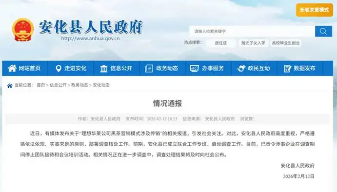 2026年2月12日,湖南安化县立刻成立联合工作组,要求涉事企业在此次期间暂停团队接待和会议培训活动,说明政府对理想华莱的营销模式进行了严格的审查。