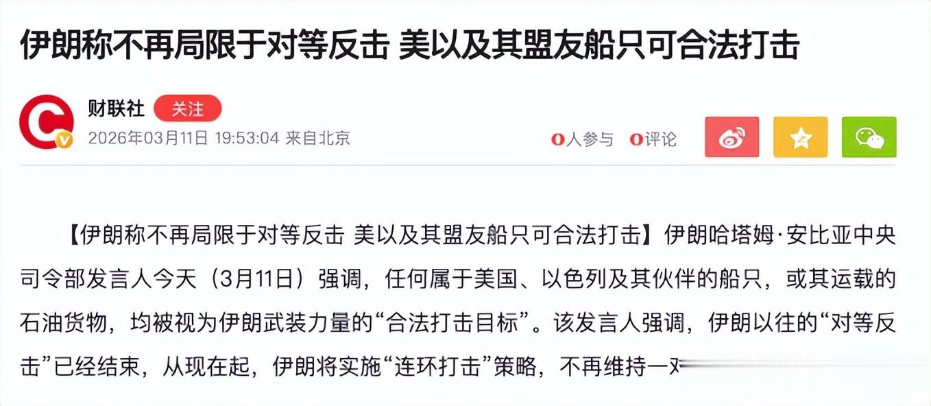 伊朗哈塔姆·安比亚中央司令部明确宣称,伊朗的军事行动已进入全新阶段,将美国、以色列及其盟友的民用船只和石油运输船列为合法打击目标。