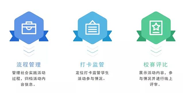 三、<流程化管理社会实践活动>:该功能主要是:流程管理、奖项评比、优化体系。利用该智慧系统可实现:信息化管理学生社会实践活动,实时监管学生打卡情况,活动过程记录。实践活动完结后提交活动材料,由学生进行各项校赛申报,评委线上评审,并颁发各奖项,完成整个社会实践活动的信息化流程管理。