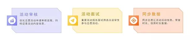四、<智慧评价志愿者服务>:该系统同样包含智能志愿者活动管理功能,同时可实现审核及填报流程。重要活动需进行面试流程后,方可申报至志愿汇进行活动创建,并自动同步志愿服务时长,为学生二课画像提供客观数据支持。