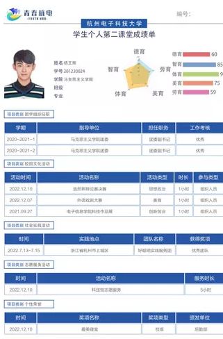 六、<客观展示二课成绩单数据>:该系统支持自动统计团学组织职位担任情况、校园文化活动、社会实践活动、志愿者活动参与情况,荣誉奖项获得情况,并根据各项内容类型计算得到学生能力模型,客观展示学生五育并举情况。同时借助该智慧系统可做到学生素质全面展示、活动数据自动统计、智能成绩单打印。