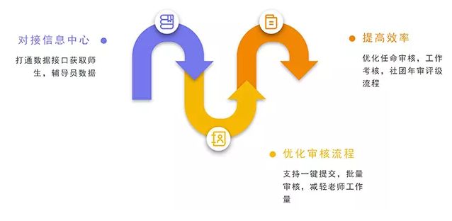 一、<优化团学组织管理>:该系统支持与信息中心打通师生数据,同步班团组织学生信息,辅导员信息,优化设置过程。各组织学生管理员可一键提交成员任命进行审核,老师可一键完成审核,提高老师任命效率。同步数据、批量审核、社团年审是该模块的一大特色,极大提升了工作效率。