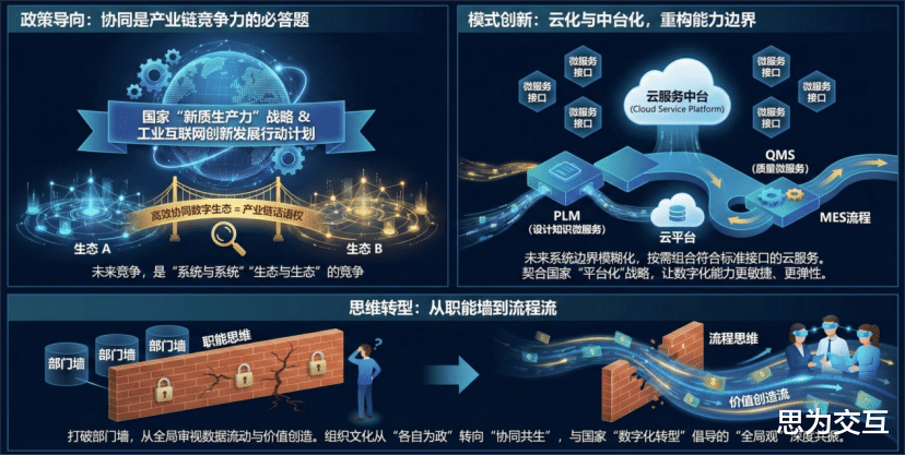 未来系统边界将模糊化,功能以“微服务”形式存在。企业无需追求“大而全”单体软件,可像搭积木般按需组合符合标准接口的云服务。例如,PLM可基于云平台提供设计知识服务,QMS作为质量微服务嵌入MES流程。这契合国家推动的“平台化”战略,让数字化能力更敏捷、更弹性。