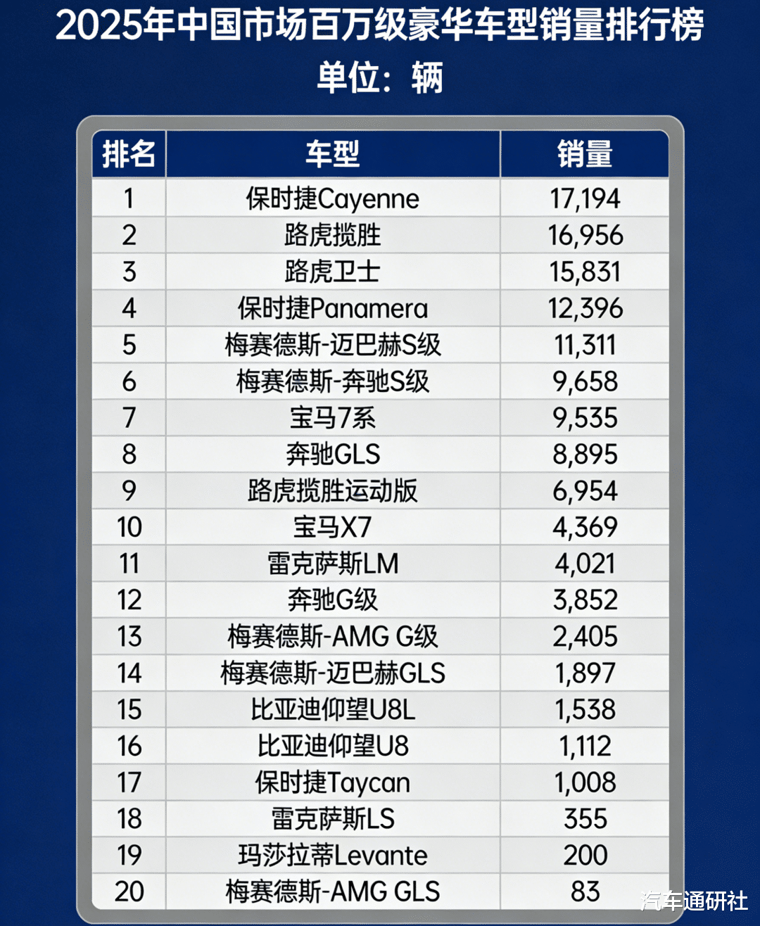 据不完全统计,目前可以确认的是,2025年百万级豪华车型的前二十排行榜中,出现了两款中国产品的身影,分别是来自仰望品牌的仰望U8、仰望U9两款产品,虽然排名不高,但却是十分难得。事实上,除了对于指导价严格限制在百万以上的产品外,还有平均成交价近百万的产品,也有不俗的销量表现,其中以尊界S800最为出彩,累计销量已经突破万台。值得注意的是,尊界S800于2025年年中才开始正式交付,也就是说它仅用时半年便来到了百万级产品年度销量的第一梯队,如果以月均销量计算,它的月销量处于妥妥的前三选手。