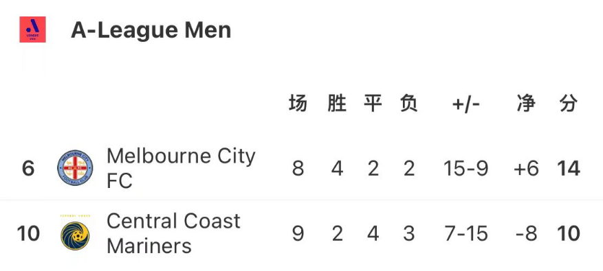 积分形势、赛事规则这是澳超第11轮的比赛,墨尔本城踢了8场澳超,积14分,排名第6,身前的麦克阿瑟、西部联,都是踢了10场澳超,积15分;中央海岸水手踢了9场澳超,积10分,排名第10。澳超分为常规赛和季后赛,本赛季新加入了奥克兰FC,总共有13支球队,每支球队要打26场常规赛,通过积分、净胜球、进球数,来决定常规赛最终的排名。澳超没有降级制度,常规赛前6名晋级季后赛,其中,前两名直接晋级半决赛,第3~6名的球队,两两厮杀,通过单回合附加赛,决出另外两个半决赛的名额,然后再进行半决赛、总决赛,决出澳超的冠军(总冠军)。