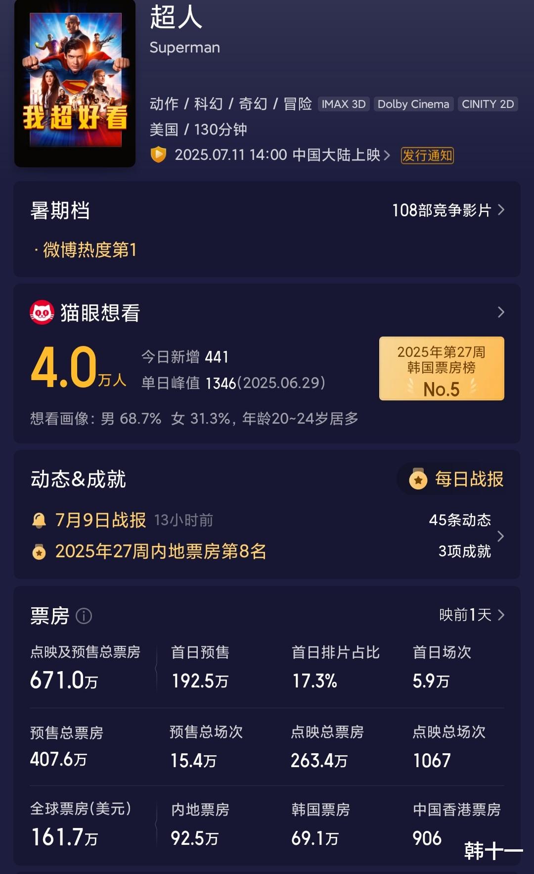 与海外的热烈追捧形成鲜明对比的是,《超人》在中国内地市场遭遇了寒冬。猫眼数据显示,影片首日排片占比 28%,看似拥有不错的上映资源,但上座率却仅为 11%,极为惨淡。北京朝阳区某影院经理无奈表示:“下午场经常出现包场情况,家长们更愿意带着孩子去看《熊出没》重映,《超人》的观影人次少得可怜。” 豆瓣平台上,《超人》开分 6.3,在竞争激烈的电影评分环境中,这一分数并不突出,大量差评集中在对新超人形象与影片质量的不满上。