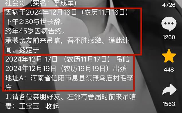 12月16号晚,网红圈突然传出悲痛消息,来自河南息县的知名网红“社会哥”不幸去世,终年45岁。