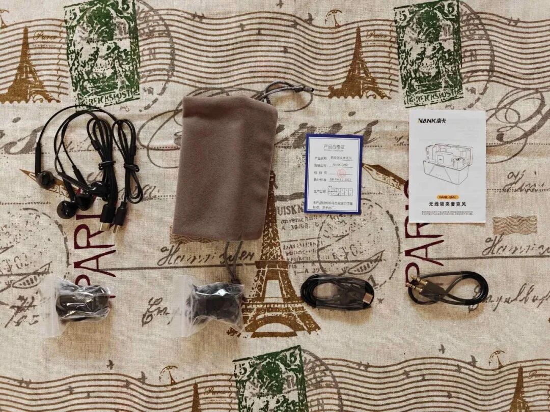 打开包装的那一刻,就能感受到南卡对用户需求的深入思考。除了常规的接收器、发射器和充电仓,随盒附赠的配件堪称豪华:两个防风毛套、Type-C充电线、两条监听耳机线、一条双头3.5mm线,还有Lightning和双Type-C转接头,甚至附赠了贴心收纳袋。