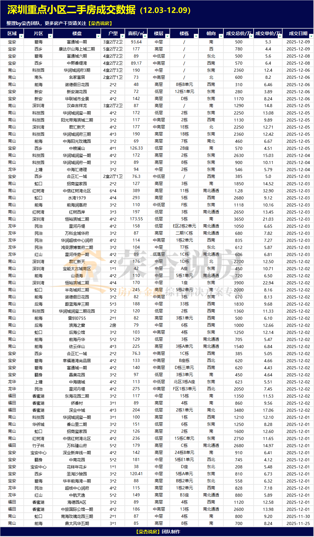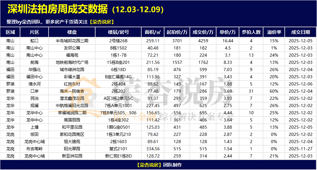 【荣杏说房】会定期发布近期深圳二手房及法拍房成交数据,所有数据均来自一线市场真实成交,供大家参考。如有错漏,欢迎指正。