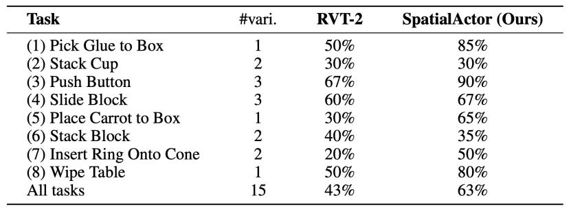 作者给出了 SpatialActor 在 18 个 RLBench 任务及其 249 种变体上的成功率。SpatialActor 取得了最佳的整体性能,超越了此前的 SOTA 模型 RVT-2 6.0%。值得注意的是,在诸如 Insert Peg(插销钉)和 Sort Shape(形状分类)等需要高空间精度的任务中,SpatialActor 的表现分别优于 RVT-2 53.3% 和 38.3%。