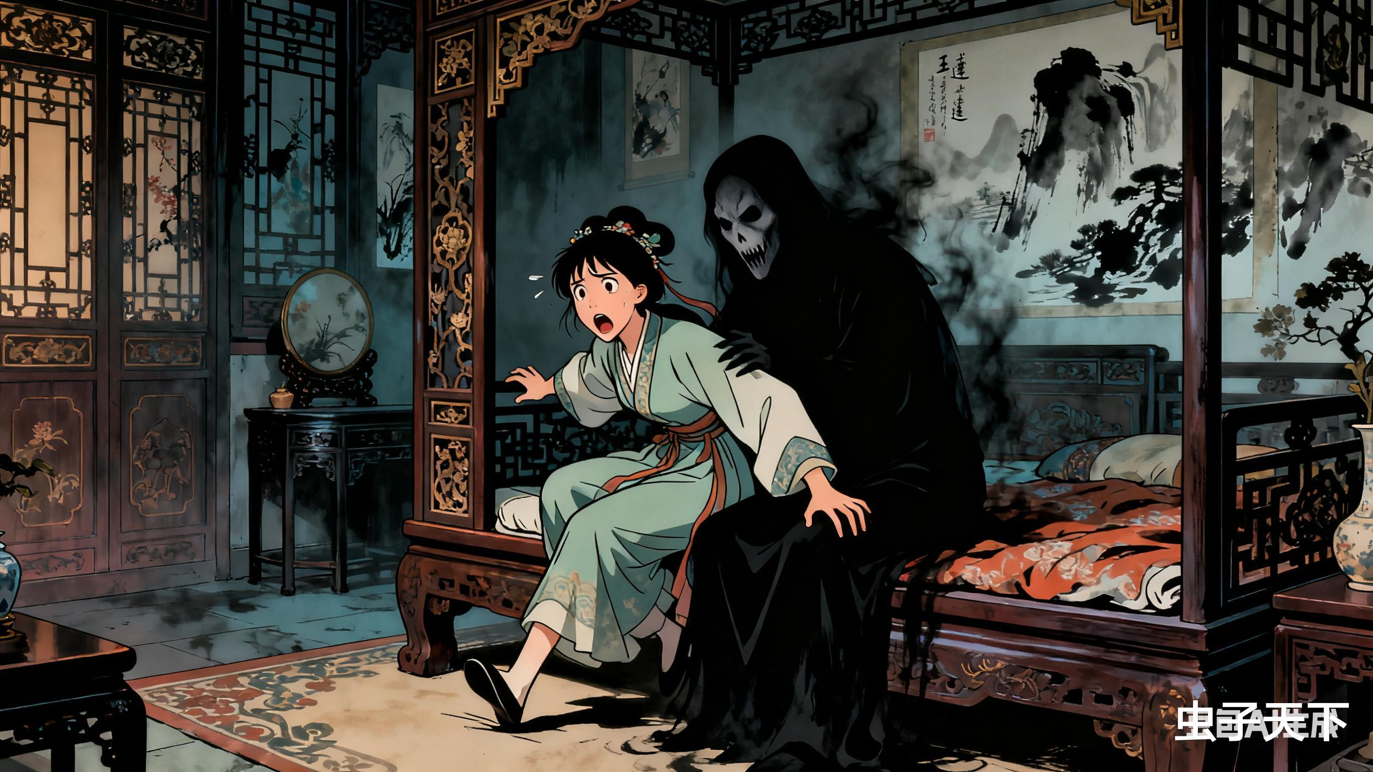 玉莲被什么东西压在床上,喘不过气,睁眼一看,黑影里坐着个穿丫鬟衣服的人,脸正贴着她后背!