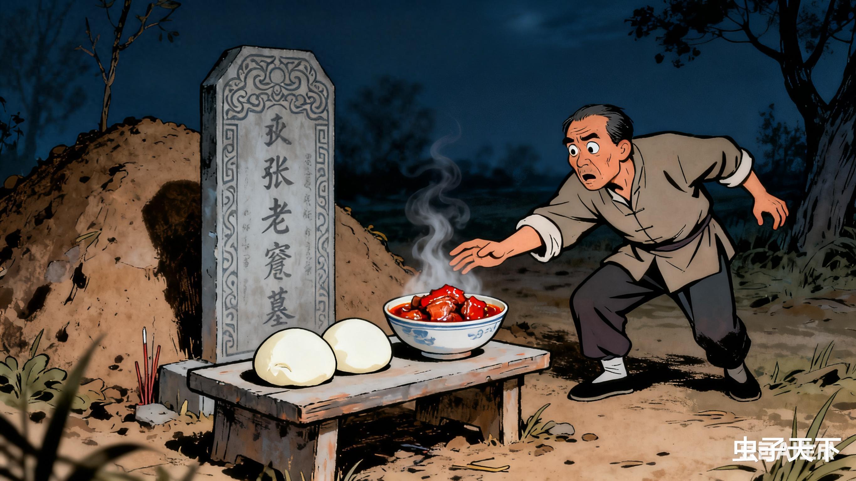 去年冬天饿得前胸贴后背,瞅见自家祖坟前的供品(三个馒头、一碗炖肉),咽了三回唾沫,终于趁夜摸了过去。