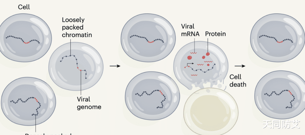 一些病毒基因组整合在宿主染色质中DNA与蛋白质结合较为松散的区域,在这些区域可以发生转录。另一些病毒DNA则整合在由于染色质包装致密而转录受到抑制的宿主基因组位点。