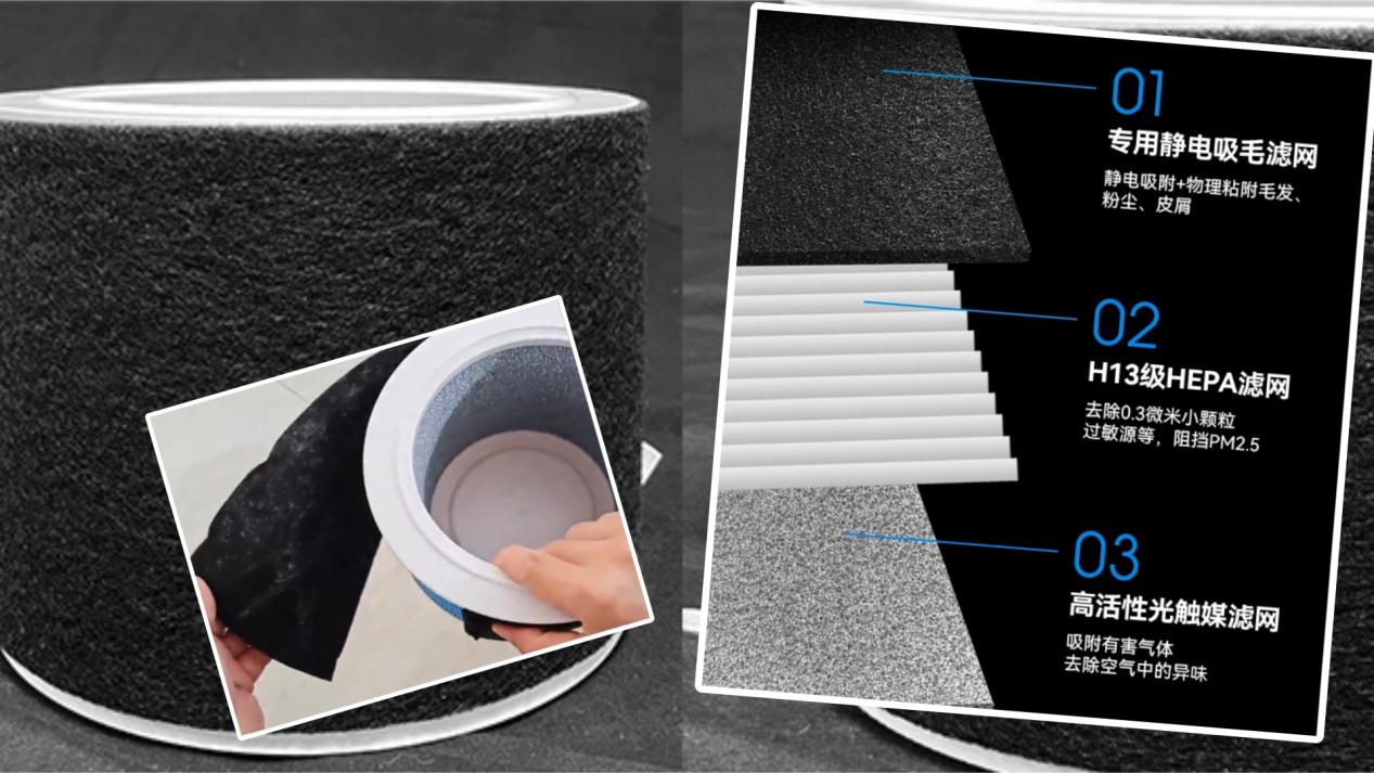 宠物空气净化器除猫毛哪个牌子好?优先选择具备“初效拦毛 + HEPA 过滤 + 光触媒除味”组合的滤网结构。初效层必须能有效拦截毛发,且支持清理或更换;HEPA 建议达到 H12 及以上,采用光触媒,直接分解异味,以免返味。