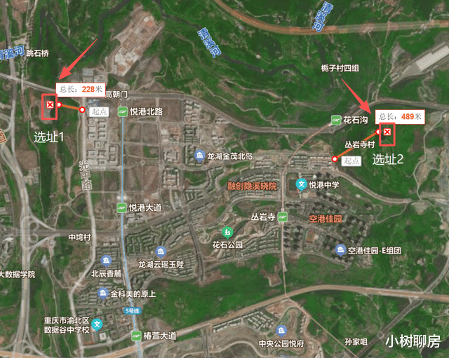 从地图上可以看到,选址1离旁边在建的花石中学仅200多米,选址2离旁边某楼盘不到500米,可以说是近在咫尺。