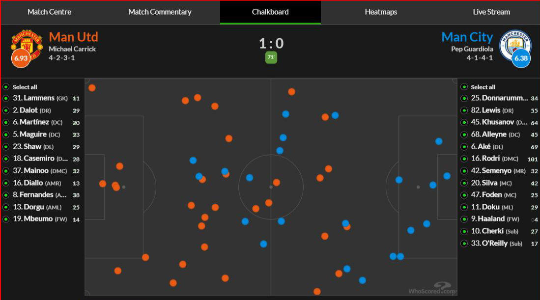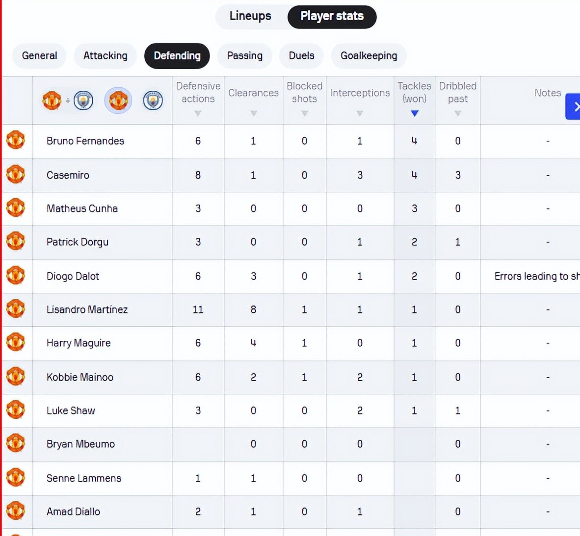 这场比赛不论是左路的多尔古、右路的阿玛德,防守到位率极高。其中B费、卡塞米罗都完成了4次抢断,并且多次完成封堵,曼联用一场全员防守的方式,封堵曼城的进攻,主打就是防守反击。