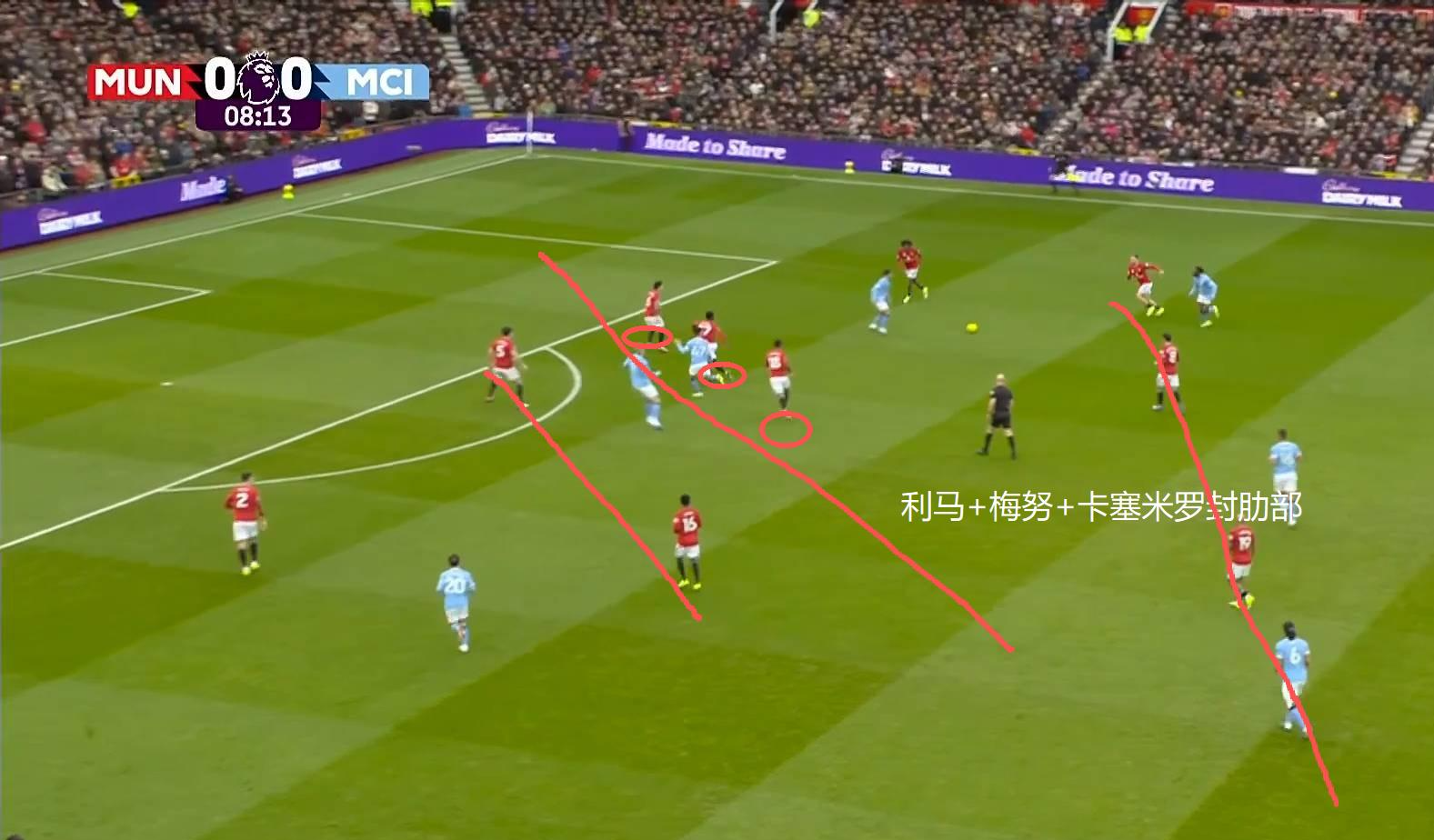 通常情况下,梅努+卡塞米罗是平行站位,当曼城的球权过渡到曼联的边路时,卡塞米罗会回到后防线上协助封堵,而梅努处于第二线,比如上图这一次进攻,曼联就形成了利马+卡塞米罗+梅努的封堵线,切断曼城向肋部的传球路线。