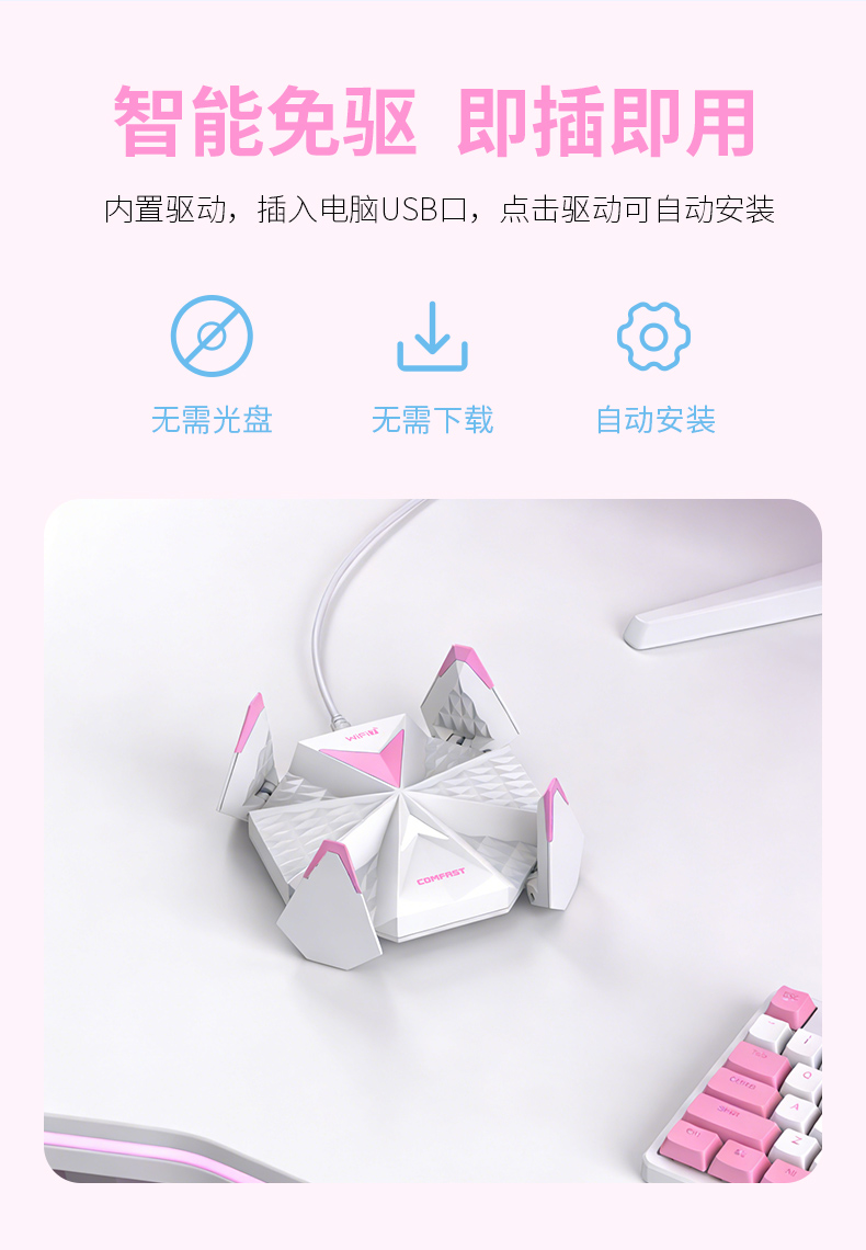 新款WiFi7无线网卡CF-988BE震撼来袭,打破传统配色的刻板印象,粉白搭配的独特造型让人眼前一亮,巧妙地将强劲配置与温柔粉韵完美融合。