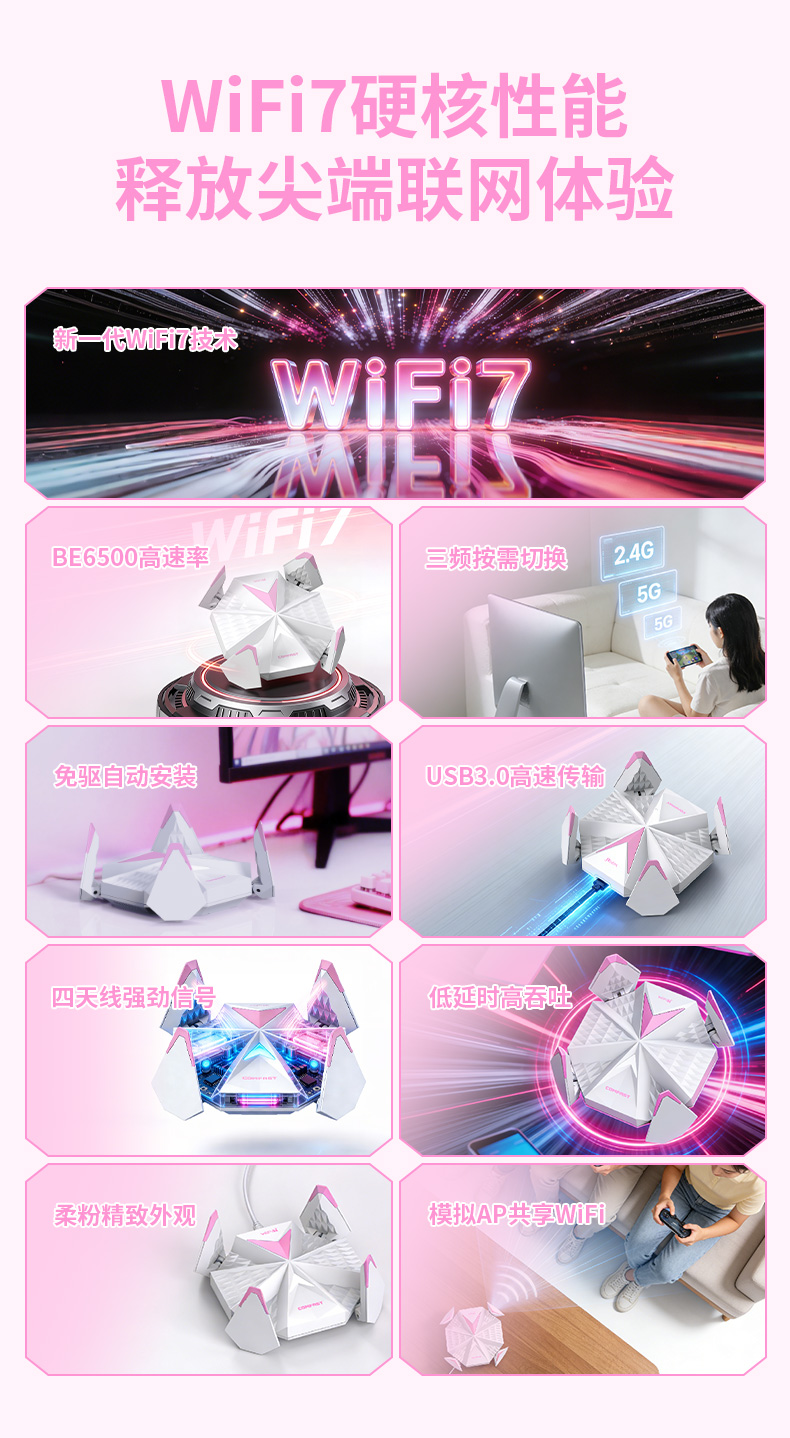 不仅是桌面吸睛好物,更是配置硬核的网络装备,实现全场景畅快联网,玩得尽兴,用得顺心。