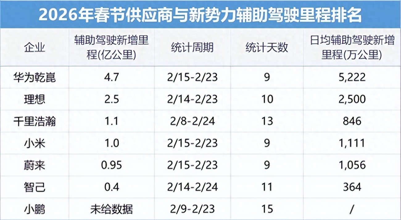 统计周期覆盖2026年2月15日至23日共9天,华为乾崑春节辅助驾驶总里程达4.7亿公里,同比增长235%,活跃用户超123万,同比增长180%;截至3月3日,累计辅助驾驶里程突破87.6亿公里,用户规模、使用深度均走在行业前沿。