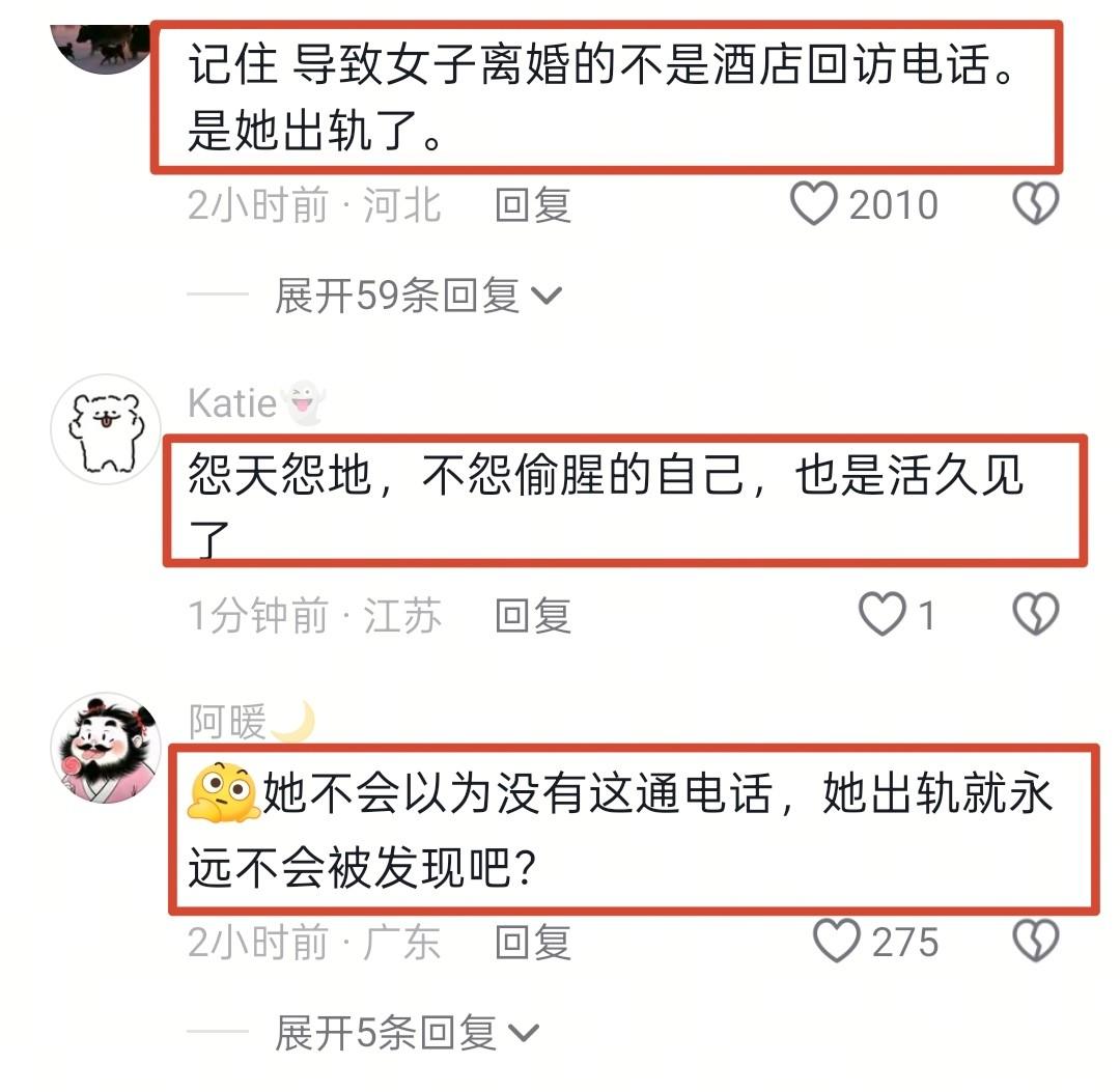 还有网友说: “情人断联,老公离婚,孩子见不着,这哪是酒店造成的?是她亲手把日子过成了这样。”