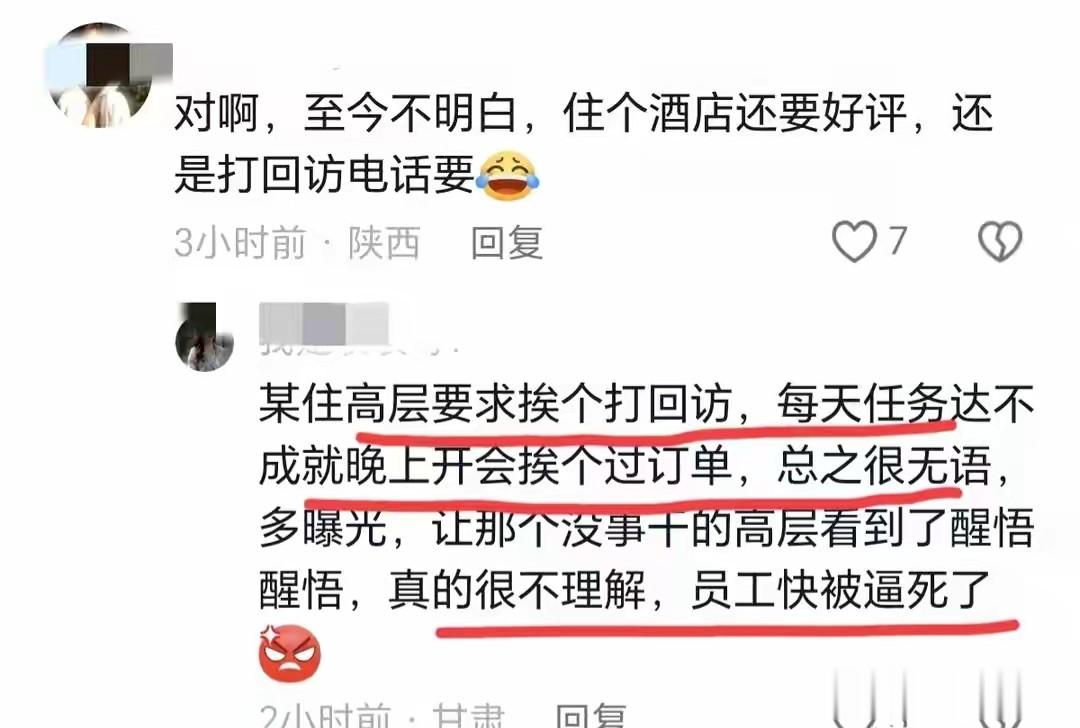 有离职员工爆料:“公司确实强制要求每天给退房客人打回访,并且部分门店还会要求每天多少条,全优好评。我就是因为不想打这个电话,才辞职的。”