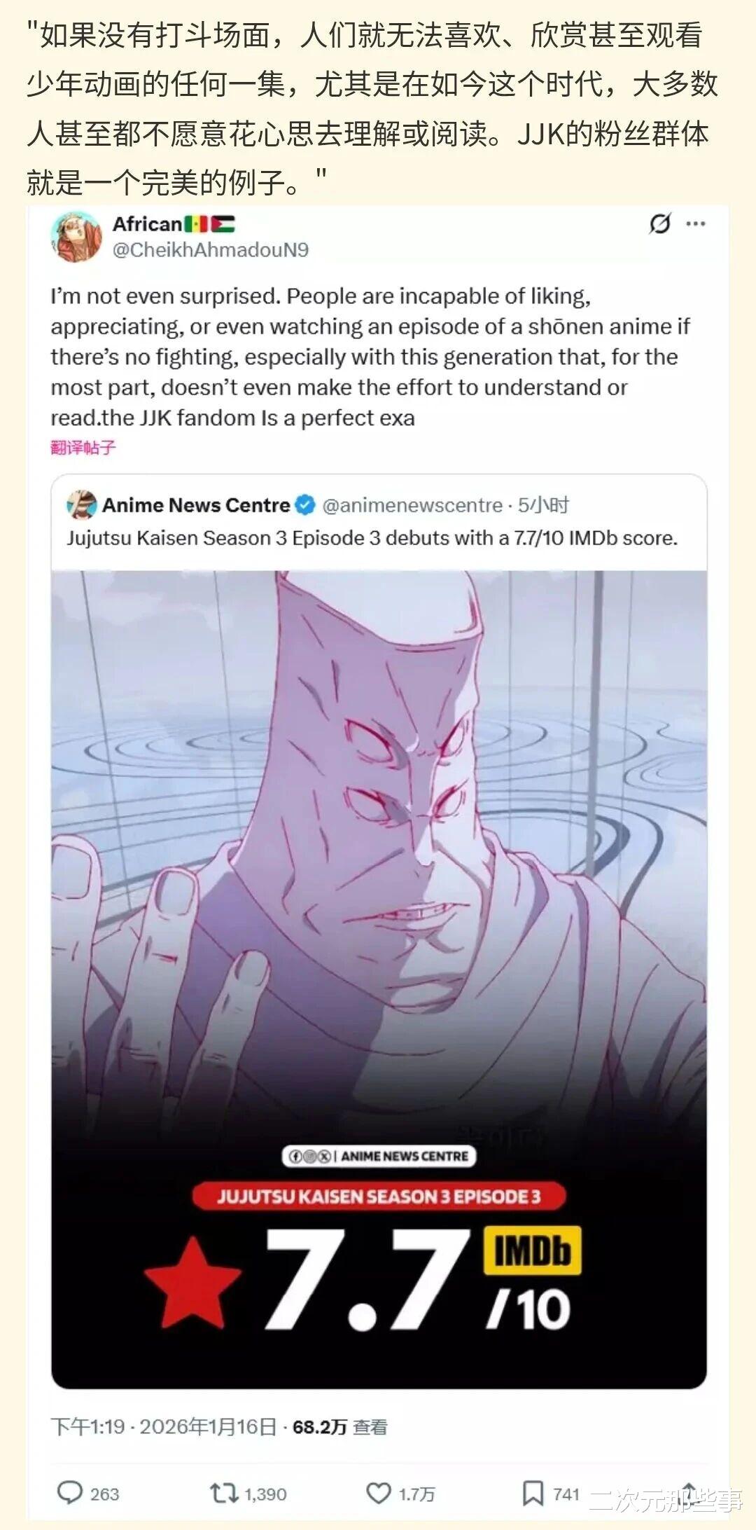 也因为这样,有国外网友就在网上直接开喷,说如果没有打斗场面,人们就无法喜欢、欣赏、观看少年动画的任何一集。尤其是现在这个时代,大多数人都不愿意去花心思去理解和阅读,《咒术回战》的粉丝就是一个完美的例子。